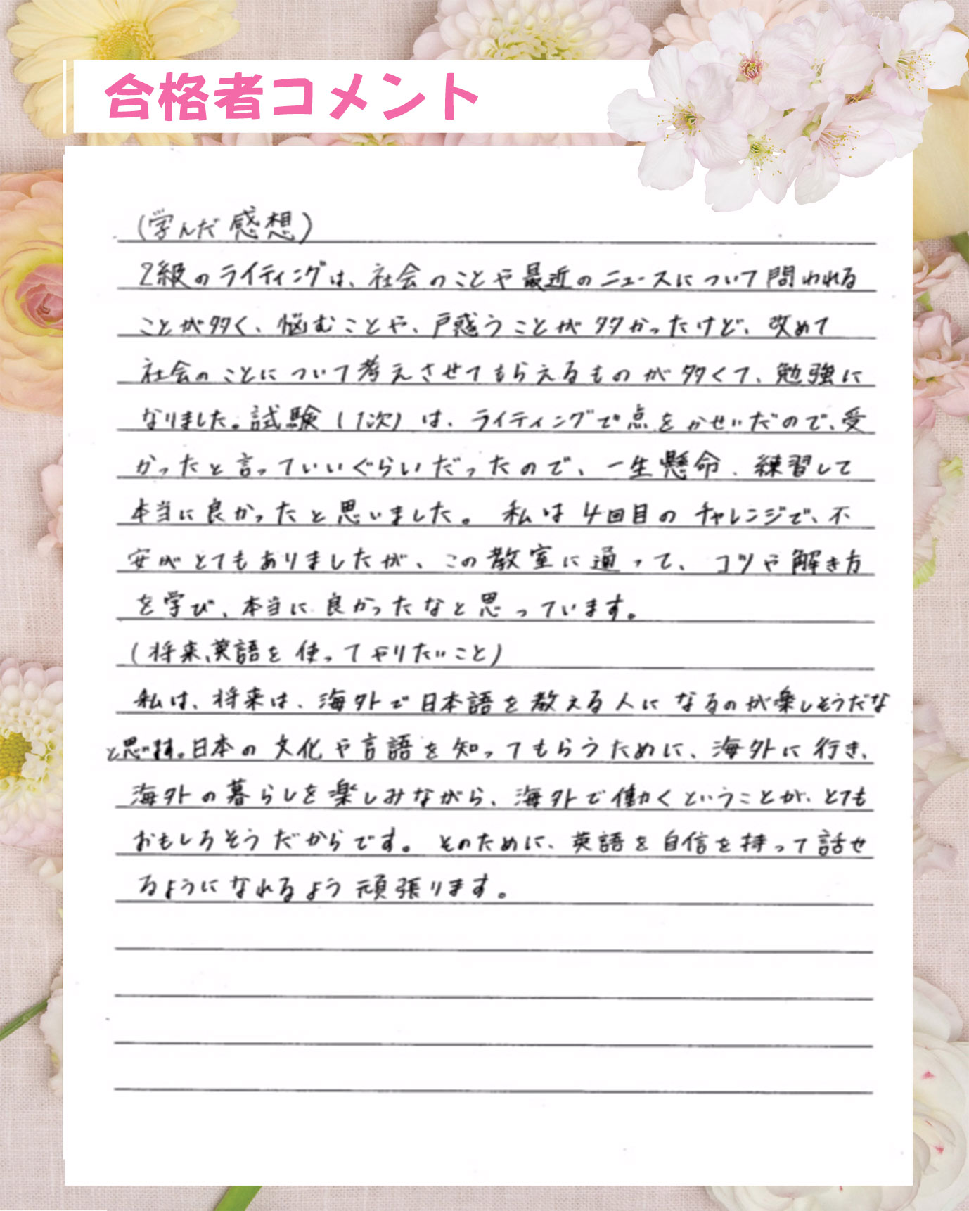 【2級合格中学生の言葉】3回受験したが上手くいかず当校入学。次の試験で合格されましたー豊中高校在学中
